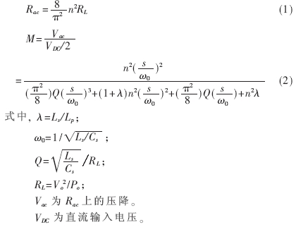 串聯(lián)電感Ls、并聯(lián)電感Lp和諧振電容Cs組成LLC諧振網(wǎng)絡,在此必須注意到負載也參與了諧振。對其進行建模,LLC簡化模型如圖2(b)所示,Ra c為副邊的負載折算到原邊的等效負載,折算公式見式(1)。因為原邊輸入電壓為方波,電流為近似正弦波,而變壓器輸出電壓也是方波,電流也是正弦波,因此可以推導出其電壓傳遞函數(shù),如式(2)所示。