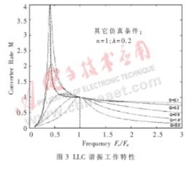 從圖3中可以看到,在整個頻率范圍內(nèi),既有降壓的工作區(qū)域(M<1),也有升壓的工作區(qū)域(M>1),因此LLC諧振有著較為廣闊的應用范圍。在輕負載時,工作頻率逐漸升高,工作在降壓區(qū)域內(nèi);而在重負載時,工作頻率逐漸降低,工作在升壓區(qū)域內(nèi)。眾所周知,串聯(lián)諧振的工作區(qū)域是Fs/Fo>1,才能工作在ZVS的狀態(tài)下。從圖3中可以看到,在不同負載(即Q不同)下,為獲得ZVS的工作條件,只要使之工作在虛線的右側(cè)即可。而LLC諧振不僅僅局限于Fs/Fo>1區(qū)域,在某些負載下可以工作在Fs/Fo<1區(qū)域,同樣可以獲得零電壓轉(zhuǎn)換的工作狀況。并且與串聯(lián)諧振相比,在不同負載時的頻率變化范圍更小。因此,LLC諧振網(wǎng)絡有著其自身獨特的優(yōu)點。