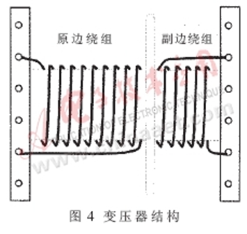 通過上面的分析知道,LLC諧振網(wǎng)絡需要兩個磁性元件Ls和Lp。然而,在實際應用中,考慮到高頻變壓器實際結(jié)構(gòu),可以把磁性元件Ls和Lp集成在一個變壓器內(nèi),利用變壓器的漏感作為Ls,利用變壓器的磁化電感作為Lp。這樣一來,可以大大減少磁性元件數(shù)目。在設計時,只要重點設計變壓器的漏感與變壓器磁化電感即可。因此,為增加漏感,需要在變壓器中加入適當?shù)臍庀叮⑶铱刂谱儔浩髟边叺睦@線方式,如圖4所示。因為變壓器的原邊繞組與副邊繞組是完全分離的,因此無須使用隔離膠帶,這樣有助于形體的小型化。