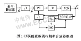 雙模前置分頻器有兩種計數(shù)工作模式,只要一個模控制信號控制就可實現(xiàn)簡單的換模計數(shù)工作,而不需要采用類似可編程分頻器的預(yù)置操作,因而其工作頻率可以做得像固定分頻器那樣高,雙模前置分頻器很好地解決了固定前置分頻器提高輸出頻率fo而降低頻率分辨率△fo的矛盾。