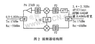 高性能的本振信號是影響混頻器輸出頻譜純度的主要因素。利用鎖相環(huán)頻率合成技術(shù)設(shè)計的本振源能為混頻電路提供性能良好的本振載波。在WLAN中,混頻器需將來自AP的2.4 GHz的信號下變換到950 MHz,以使信號能在特定的電纜上傳輸?;祛l器結(jié)構(gòu)圖如圖2所示。ADF4360-4產(chǎn)生1.5 GHz的本地振蕩器(LO),混頻器采用AD8343,F(xiàn)1為900 MHz~1000 MHz的帶通濾波器。F2為24 GHz~2.5 GHz的帶通濾波器。PA的信號功率較大,超過AD8343門限,必須衰減,ATT為衰減網(wǎng)絡(luò)。
