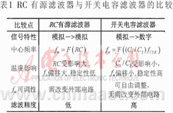開關(guān)電容濾波器與RC有源濾波器比較如表1所示。傳統(tǒng)濾波器的中心頻率與電阻和電容有關(guān),兩者的微小變化都會引起中心頻率出現(xiàn)較大偏移。開關(guān)電容濾波器可以自由調(diào)整中心頻率,且當(dāng)電容值隨溫度發(fā)生漂移時,兩個電容值同向改變,維持了電容比值的穩(wěn)定,使得中心頻率具有很高的溫度穩(wěn)定性。