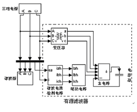 該有源濾波器主要由諧波電流檢測電路、驅(qū)動電路、主電路、電容器和變壓器5大部分組成。變壓器的設置主要是為調(diào)節(jié)有源電力濾波器交流側電壓之用。其原理如圖1所示。其中的諧波源模塊是根據(jù)主提升機房實際諧波測試數(shù)據(jù)建成的。