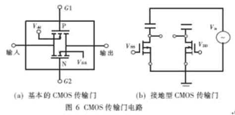 基本的CMOS傳輸門如圖6(a)所示。當傳輸門導通時,在輸入與輸出之間呈現(xiàn)低電阻,它允許電流向兩個方向中的任一方向流經(jīng)此門。此時,輸入線的電壓必須比N溝器件的襯底電壓(VSS)為正,比P溝器件的襯底電壓(VDD)為負。這導致了傳統(tǒng)的CMOS傳輸門和以此為基礎構(gòu)成的CMOS模擬開關難以適應大信號的傳輸[4~5]。