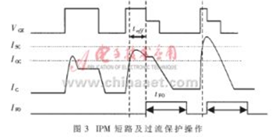 ,大多數(shù)IPM采用兩級關(guān)斷模式,過流保護(hù)和短路保護(hù)操作可參見圖3。其中,VG為內(nèi)部門極驅(qū)動電壓,ISC為短路電流值,IOC為過流電流值,IC為集電極電流,IFO為故障輸出電流。