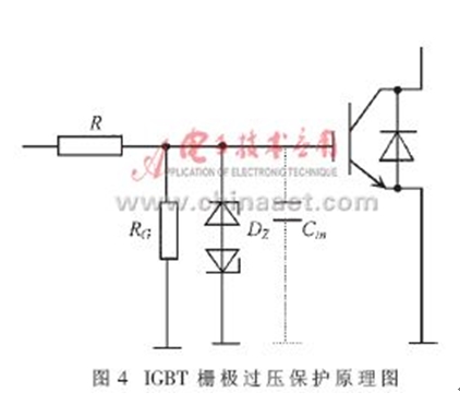 IGBT的驅(qū)動設(shè)計問題亦即MOSFET的驅(qū)動設(shè)計問題;設(shè)計時應(yīng)注意以下幾點:①IGBT柵極耐壓一般在±20V左右,因此驅(qū)動電路輸出端要給柵極加電壓保護(hù),通常的做法是在柵極并聯(lián)穩(wěn)壓二極管或者電阻。前者的缺陷是將增加等效輸入電容Cin,從而影響開關(guān)速度,后者的缺陷是將減小輸入阻抗,增大驅(qū)動電流,使用時應(yīng)根據(jù)需要取舍。圖4為IGBT柵極保護(hù)原理圖,其中,RG、DZ、Cin分別為等效柵極阻抗、穩(wěn)壓管和等效輸入電容。②盡管IGBT所需驅(qū)動功率很小,但由于MOSFET存在輸入電容Cin,開關(guān)過程中需要對電容充放電,因此驅(qū)動電路的輸出電流應(yīng)足夠大,這一點設(shè)計者往往忽略。假定開通驅(qū)動時,在上升時間tr內(nèi)線性地對MOSFET輸入電容Cin充電,則驅(qū)動電流為