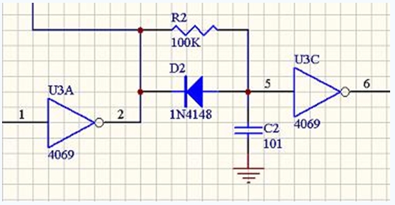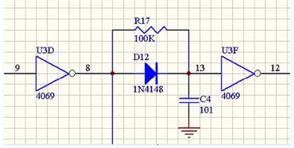 在前級(jí)邏輯電路里,有意地對(duì)控制PMOS的下降沿和控制NMOS的上升沿進(jìn)行延時(shí),再整形成方波,也可以避免場(chǎng)效應(yīng)管的共態(tài)導(dǎo)通。另外,這樣做可以使后級(jí)的柵極驅(qū)動(dòng)電路簡(jiǎn)化,可以是低阻推挽驅(qū)動(dòng)?xùn)艠O,不必考慮柵極電容,可以較好的適應(yīng)不同的場(chǎng)效應(yīng)管。2003年Robocon比賽采用的就是這種驅(qū)動(dòng)電路。下圖是兩種邊沿的延時(shí)電路: