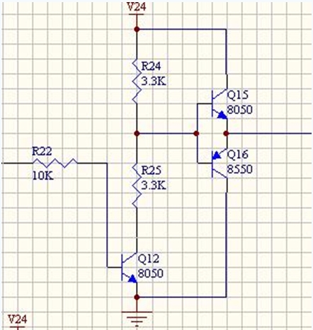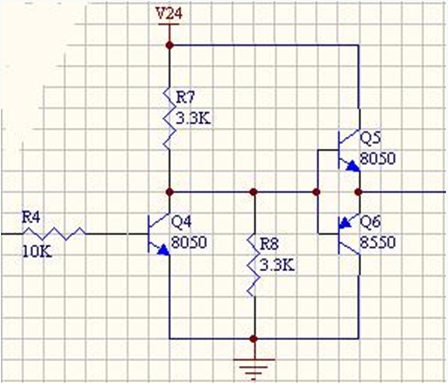 后面三極管和電阻,穩(wěn)壓管組成的電路進(jìn)一步放大信號(hào),驅(qū)動(dòng)場(chǎng)效應(yīng)管的柵極并利用場(chǎng)效應(yīng)管本身的柵極電容(大約1000pF)進(jìn)行延時(shí),防止H橋上下兩臂的場(chǎng)效應(yīng)管同時(shí)導(dǎo)通(“共態(tài)導(dǎo)通”)造成電源短路。