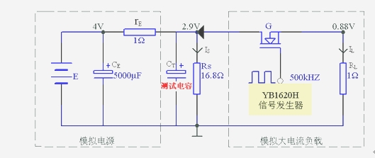 由E、CE、rE組成模擬電源,電源電壓E=4 V,電源內(nèi)阻rE=1Ω;CT為去耦(測試)電容;