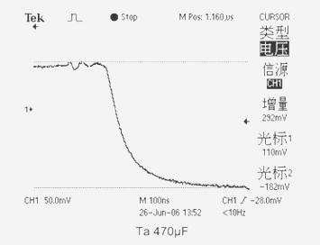 2、當(dāng)測試電容為(Ta)鉭電解電容器CT=470μF ESR=149mΩ時,輸出電壓下跌值為292mV。