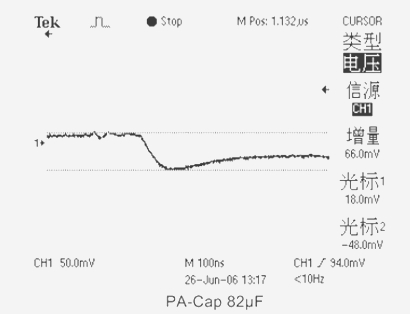 5、當(dāng)測試電容采用(PA-Cap)聚合物片式疊層鋁電解電容器CT=82μF ESR=13mΩ時,輸出電壓下跌值僅為66mV。