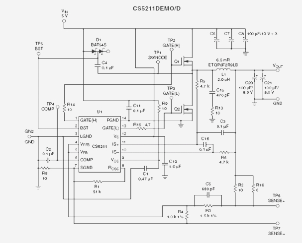 根據(jù)DC/DC變換器生產(chǎn)商提供的評估板資料和典型應(yīng)用電路,PA-Cap作為濾波電容在DC/DC變換器CS5211DEMO/D評估板線路中的應(yīng)用,實(shí)驗(yàn)的線路原理圖如圖2。