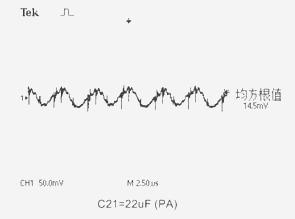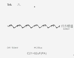 電路中電壓輸入端C6.7.8接入PA-Cap 6.3V/22μF。在輸出端C20.21位置分別接上鉭電解電容器:10V/470μF、16V/220μF和PA-Cap聚合物電容器:10V/22μF、4V/82μF作為濾波電容器,用示波器測量電路的輸出紋波電壓Vr。