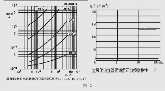 而鋁電解電容器的損耗非常大,其中用功損耗可以占到總無功容量的20%,且鋁電解電容器有功損耗隨著頻率的增大而增大,頻率超過1000赫茲損耗變化率逐漸增大,當(dāng)頻率超過10000赫茲后變化率急劇增加,有功損耗增大,發(fā)熱量增大。圖2中顯示了鋁電解電容器損耗頻率特性(國外某著名鋁電解電容器生產(chǎn)公司提供),這也正是長久以來在中、高頻大功率環(huán)境下采用鋁電解直流濾波電容器發(fā)熱量大、故障率高的根本原因。而金屬化電容器固有損耗非常小,整臺電容器損耗小于2‰,僅為鋁電解電容器1%,且采用聚丙烯薄膜作為介質(zhì),產(chǎn)品頻率特性很穩(wěn)定,如圖2所示,故在中、高頻環(huán)境下采用金屬化直流濾波電容器,可以大幅度降低線路損耗,避免發(fā)熱,穩(wěn)定性非常高。
