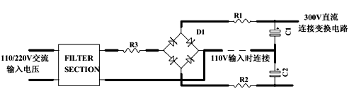 圖5所示為沖擊電流限制電阻的通常位置,對于110V、220V雙電壓輸入電路,應該在R1和R2位置放兩個電阻,這樣在110V輸入連接線連接時和220V輸入連接線斷開時的沖擊電流一樣大。對于單輸入電壓電路,應該在R3位置放電阻。