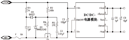 圖7所示電路為長短針法沖擊電流限制電路,在DC/DC電源板插入時,長針接觸,輸入電容C1通過電阻R1充電,當電源板完全插入時,電阻R1被斷針短路。C1代表DC/DC電源的所有電容量。