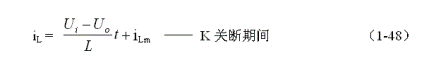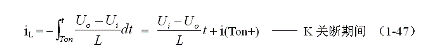 式中i(Ton+)為控制開(kāi)關(guān)K從Ton轉(zhuǎn)換到Toff的瞬間之前流過(guò)電感的電流,i(Ton+)也可以寫(xiě)為i(Toff-),即:控制開(kāi)關(guān)K關(guān)斷或接通瞬間,之前和之后流過(guò)電感L的電流相等。實(shí)際上(1-47)式中的i(Ton+)就是(1-45)式中的iLm,因此,(1-9)式可以改寫(xiě)為: