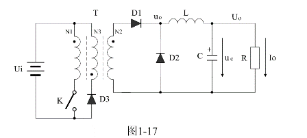 在圖1-17中,需要特別注意的是開關(guān)變壓器初、次級線圈的同名端。如果把開關(guān)變壓器初線圈或次級線圈的同名端弄反,圖1-17就不再是正激式變壓器開關(guān)電源了。