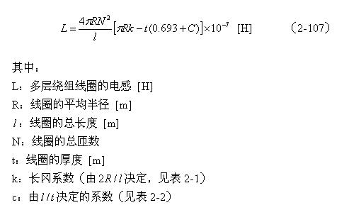 【說(shuō)明】上式是用來(lái)計(jì)算多層線圈繞組、截面為圓形的空心線圈的電感計(jì)算公式。長(zhǎng)岡系數(shù)k可查閱表2-1,系數(shù)c可查閱表2-2。當(dāng)線圈內(nèi)部有磁芯時(shí),有磁芯線圈的電感是空心線圈電感的
