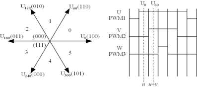 如圖2所示,電機(jī)的驅(qū)動(dòng)采用了七段式的空間矢量法(SVPWM,SpaceVectorPWM),利用六個(gè)依次相差60度的基本矢量和全0矢量(與全1矢量等效),根據(jù)不同的作用時(shí)間合成按給定轉(zhuǎn)速作圓周轉(zhuǎn)動(dòng)的旋轉(zhuǎn)矢量。