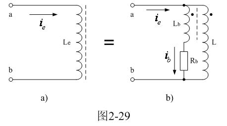 圖2-29-a中,Le是一個(gè)同時(shí)考慮渦流損耗因素的電感;L是變壓器原初級(jí)線圈的電感;Rb是鐵芯渦流損耗電阻;Lb是一個(gè)互感線圈,通過(guò)它把流過(guò)電阻Rb的電流感應(yīng)到變壓器初級(jí)線圈中;當(dāng)流過(guò)電阻Rb的電流增加時(shí),流過(guò)通過(guò)Lb互感線圈的感應(yīng)作用,使流過(guò)變壓器初級(jí)線圈L的電流也同時(shí)增加。