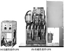 無變壓器UPS可以取消的元件,如圖7所示,稱為傳統(tǒng)UPS的“磁性套件”。它包括輸出變壓器、輸入電感、DC母線電抗器、輸出濾波器電感和輸入諧波濾波器電感。它們不但十分沉重,而且體積巨大,和旁邊的無變壓器UPS的部件相比差別十分明顯。
