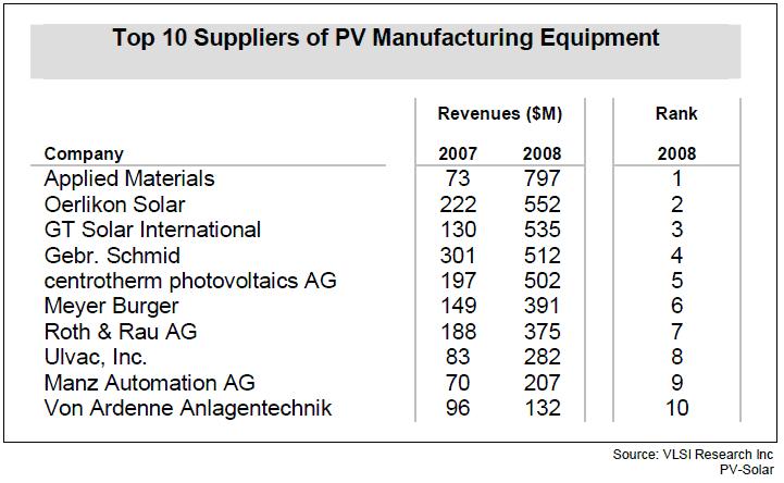 VLSI Research的數(shù)據(jù)顯示,Applied Materials全年晶體硅太陽能設備和薄膜太陽能設備收入總和達到了7.97億美元,超過了排在第二位的Oerlikon Solar,該公司收入額為5.52億美元。