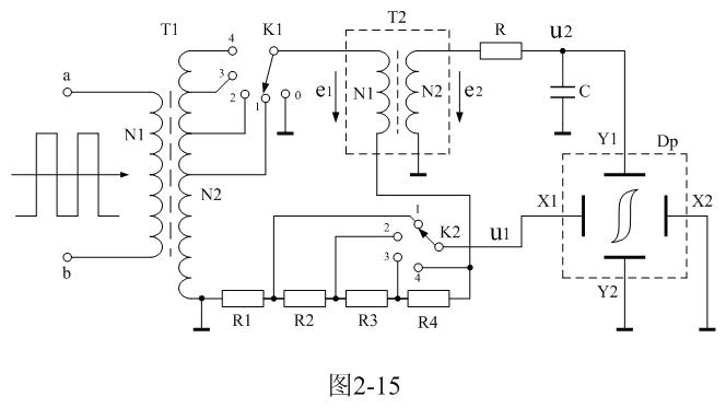 在圖2-15中,變壓器T1為信號源,通過K1選擇變壓器T1次級線圈的抽頭就可以改變信號源的電壓輸出;T2為待測變壓器樣品,Dp為示波器;R1、R2、R3、R4為顯示磁場強度H的取樣電阻,取樣電壓u1作為示波器X軸偏轉(zhuǎn)顯示輸入電壓,通過K2可以選擇取樣電壓輸出,從而可以改變示波器X軸偏轉(zhuǎn)顯示的寬度;電阻R和電容C為積分電路,積分電壓u2由電容C兩端輸出,作為示波器Y軸偏轉(zhuǎn)顯示輸入電壓,以顯示磁通密度B。