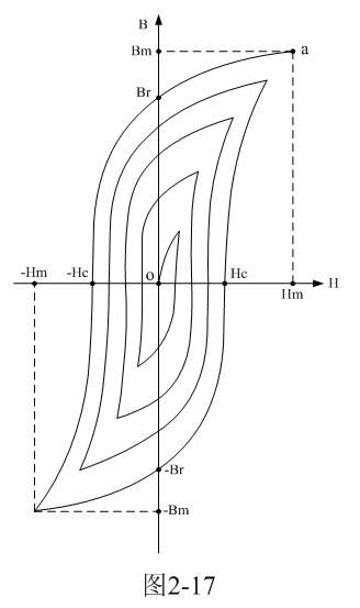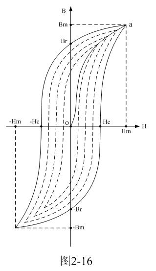 磁矯頑力的大小反映鐵磁材料保持剩磁狀態(tài)的能力。圖2-16表明,當磁場按Hm→0→-Hc→-Hm→0→Hc→Hm次序變化時,B所經(jīng)歷的相應變化為Bm→Br→0→-Bm→-Br→0→Bm。于是得到一條閉合的B~H曲線,稱為磁滯回線。所以,當鐵磁材料處于交變磁場中時(如變壓器中的鐵芯),它將沿磁滯回線反復被磁化→去磁→反向磁化→反向去磁,這個過程周而復始。