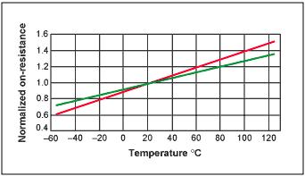 圖2.典型功率MOSFET的導通電阻的溫度系數(shù)在0.35%每度(綠線)至0.5%每度(紅線)之間