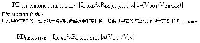 其中,RDS(ON)SPEC是計算所用的MOSFET導通電阻,TSPEC是規(guī)定RDS(ON)SPEC時的溫度。利用計算出的RDS(ON)HOT,可以確定同步整流器和開關(guān)MOSFET的功率消耗,具體做法如下所述。