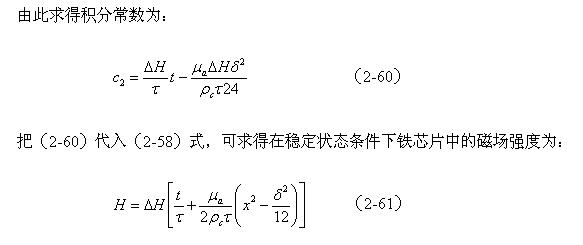 圖2-21就是用來求鐵氧體圓柱體變壓器鐵芯內(nèi)某截面磁場分布的原理圖,圖中虛線表示交變磁場在變壓器鐵芯內(nèi)部感應(yīng)產(chǎn)生渦流。我們用同樣的方法,從(2-59)開始對表示磁場分布的(2-58)式進行積分求平均值,然后求出積分常數(shù)c2,即可以求得圓柱體鐵芯內(nèi)的磁場分布式: