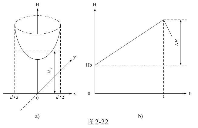 圖2-22-a和圖2-22-b是圓柱形鐵芯中磁場強度按水平分布的函數(shù)H(x,y)曲面圖和按時間分布的函數(shù)H(t)曲線圖。