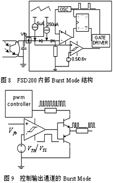 而FSD200則是通過(guò)控制內(nèi)部驅(qū)動(dòng)器實(shí)現(xiàn)可控脈沖模式,即將Vfo 腳的反饋電壓與0.6V/0.5V遲滯比較器比較,由比較結(jié)果控制門(mén)極驅(qū)動(dòng)輸出,其結(jié)構(gòu)可見(jiàn)圖8。我們可根據(jù)此原理用分立元件實(shí)現(xiàn)普通芯片的BurstMode功能,即檢測(cè)次級(jí)電壓判斷電源是否處于待機(jī)狀態(tài),通過(guò)遲滯比較器,控制芯片輸出,電路如圖9所示。