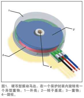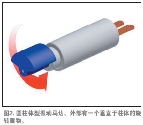 多數(shù)振動馬達由一個較小的電動馬達驅動一個偏心配重,如圖1所示。馬達為直流有刷或無刷電機,有兩種基本的結構:硬幣狀(扁平)與圓柱形(條狀)。