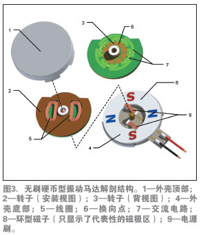 如前所述,無刷電機具有較長的壽命,并由于產(chǎn)生的電火花較少,也沒有了RFI干擾。無刷直流(BLDC)設計還提供業(yè)內直徑最小、厚度最薄的扁平振動馬達。圖4介紹了這種馬達的基本構造。