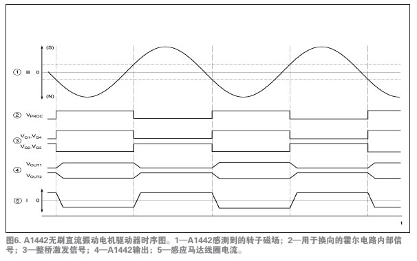 A1442是驅動馬達唯一必須的的IC。圖5所示的功能模塊圖說明了設備運行和先進的特性。注意圖4和圖5中,采用集成的霍爾傳感器免除了外部霍爾傳感器,從而減少了馬達PCB元件數(shù)量。唯一所需的外部元件是一種標準電路特性——位于應用馬達安裝PCB上的0.1µF的旁路電容,它用于降低在開關電源的電感負載時產(chǎn)生的瞬時電壓峰值。