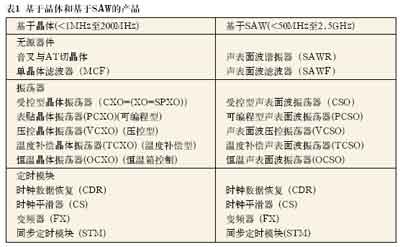 在有線與無線市場(chǎng)迅猛增長的推動(dòng)下,石英晶體及其高頻版SAW器件正廣泛用于各個(gè)領(lǐng)域,小到電子玩具中簡單的無源石英晶體,大到用于最先進(jìn)的電信網(wǎng)絡(luò)骨干網(wǎng)定時(shí)的復(fù)雜同步定時(shí)模塊(STM),如表1所示。