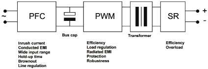 脈寬調(diào)制級(PWM)是主要的轉(zhuǎn)換器級。其中DC電壓被斬波為更高頻率的方波,因此利用更小的變壓器就可以轉(zhuǎn)換到另一個電壓級并提供隔離。并非所有的拓撲都采用占空比變化的方波,有些拓撲采用的是變頻,還有的則是改變兩個脈沖序列之間的相位。這一級主要確定轉(zhuǎn)換器的效率和負載調(diào)節(jié)。轉(zhuǎn)換器效率十分重要,首先它關(guān)系電源的運行成本;其次是必須通過機箱冷卻來散除產(chǎn)生的熱量;第三是熱組件越大,就越昂貴,占用空間也越大。這三個因素與電源的使用壽命成本關(guān)系重大。