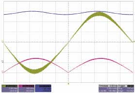 此外,它的功率要求很低,既提高了效率也降低了組件成本。該PFC還帶有峰值限流、輸入電壓中斷保護功能,還有一個過壓比較器,可在發(fā)生負載突然減小事件時關(guān)斷PFC部分。時鐘輸出信號可用來同步下游的PWM級,以減少系統(tǒng)噪聲。圖3中,綠色曲線的較厚區(qū)域代表電流紋波,PFCIC在峰值輸入電壓下消耗電流較多,過零時沒有電流。粉色曲線代表整流器輸入電壓,藍色曲線為輸出電壓。