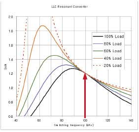 利用PFC級,LLC轉(zhuǎn)換器的輸入可設(shè)置在400V左右。如果所需輸出電壓為12V、匝數(shù)比為40:1,則額定負載下需要1.2的DC增益。無論負載情況如何,頻率始終不變。