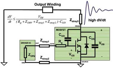 圖7解釋了讓柵極驅(qū)動器靠近功率MOSFET為什么如此有用。柵極驅(qū)動器的非零輸出阻抗ZDRV必須通過寄生阻抗Zstray1和Zstray2,以及柵極阻抗Rg來控制MOSFET,尤其是關(guān)斷。這時,漏極上的高dV/dt加上柵極路徑上的高阻抗,可能引起MOSFET的寄生導通。而利用極短的連線和功能強大的柵極驅(qū)動器,幾乎可以實現(xiàn)完美的開關(guān)。