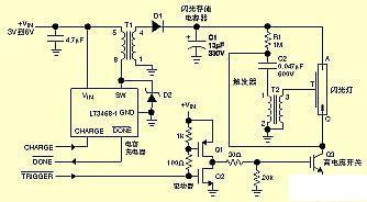 閃光電容器充電器基本上是一種具有某些特殊能力的變壓器耦合升壓轉(zhuǎn)換器。當(dāng)其“充電”控制線為高電位時,穩(wěn)壓器同步內(nèi)部功率開關(guān),使升壓變壓器產(chǎn)生高電壓脈沖。然后,這些脈沖再經(jīng)整流和濾波,產(chǎn)生300V的直流輸出,其轉(zhuǎn)換效率高達(dá)80%。