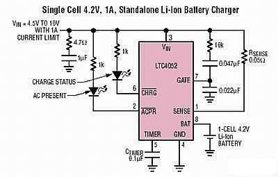 LTC4052需要一個電流受限的墻上適配器,以控制充電電流的大小。它還需配備過流保護(hù)電路,以便在意外使用較高電流或墻上適配器發(fā)生故障時能提供保護(hù)。LTC4052是一款全集成的脈沖充電器,無需使用外部MOSFET或阻流二極管(見圖3)。這款獨立的充電器IC具有C/10檢測、充電狀態(tài)指示、充電結(jié)束定時器、墻上適配器檢測及過流保護(hù)等功能。LTC4052的輸入電源可以是4.5V到12V,并具有1%的飄移電壓精度。