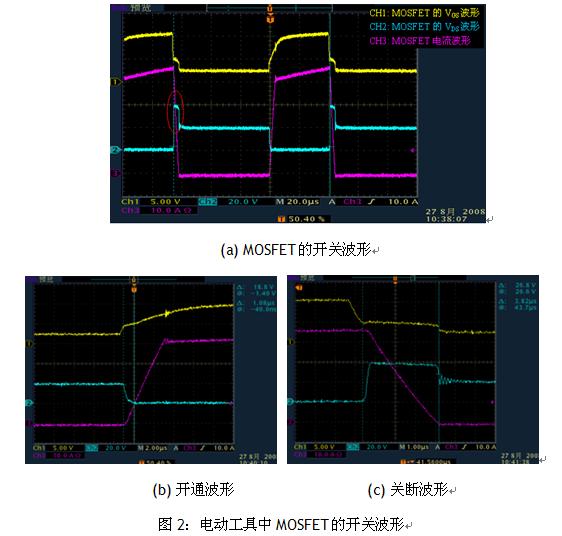 圖2為電動工具中MOSFET(AOT500)的開關(guān)波形。