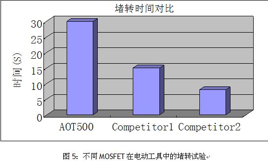 圖5為AOT500在電動工具中的堵轉(zhuǎn)試驗(yàn)時(shí)間對比,可以看出,AOT500能承受的堵轉(zhuǎn)時(shí)間比其它的電動工具常用的MOSFET要長很多,大大提高了電動工具的可靠性。