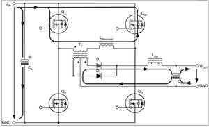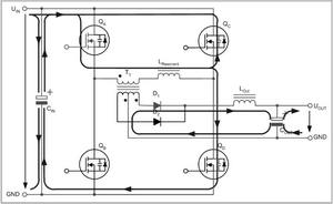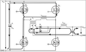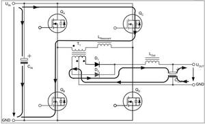 兩個互為對角的全橋開關不是同時驅(qū)動,而是通過相移的方法在啟動命令之間引入預定義的短期延遲。這種延遲由控制電路的電壓回路進行調(diào)節(jié),從而在兩個驅(qū)動信號之間產(chǎn)生相移。這種相移技術的特殊之處在于,它可啟動兩個與變壓器串聯(lián)的開關,而變壓器的電壓卻為零。