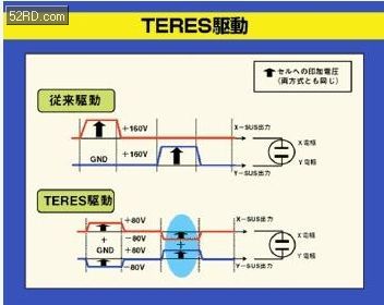為了降低PDP的用電,F(xiàn)ujitsu-Hitachi(富士通日立,富士通也是PDP的發(fā)創(chuàng)業(yè)者)提出了TERES(TechnologyofReciprocalSustainer)技術(shù),將X、Y電極的電位交替由「0V:160V、160V:0V」改成「+80V:-80V、-80V:+80V」的方式,同時為彌補(bǔ)驅(qū)動電壓的改變而將交替頻率提升一倍。
