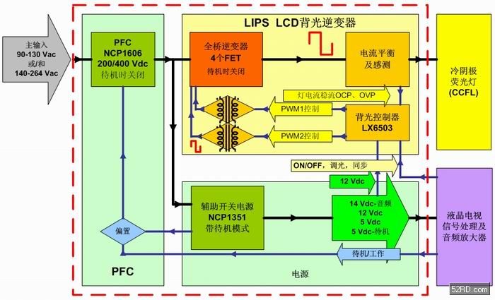 圖2:安森美半導(dǎo)體針對32英寸液晶電視的全橋高壓LIPS解決方案功能框圖。