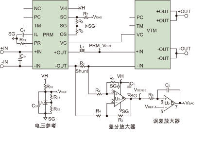 上述電路由電壓參考、分流電阻、差分放大器和誤差放大器組成。低端檢測電路是在PRM輸出端用配置為差分放大器的一個運(yùn)放實現(xiàn)的。分流電阻(R1)上的電壓經(jīng)檢測并被放大電阻R2到R5確定的增益倍數(shù)。參考電壓使用精確可調(diào)的分流參考產(chǎn)生,并連接到誤差放大器的同相端子。這是誤差放大器用以與差分放大器輸出(VSENSE)比較的電壓。誤差放大器的輸出(VEAO)經(jīng)過電阻R7和R8連接到SC,從而實現(xiàn)PRM輸出設(shè)置點的調(diào)整。誤差放大器將調(diào)整PRM輸出電壓,直到VSENSE等于參考電壓VREF。這將迫使VTM輸入電流以及VTM輸出電流成為由VREF確定的常數(shù)。